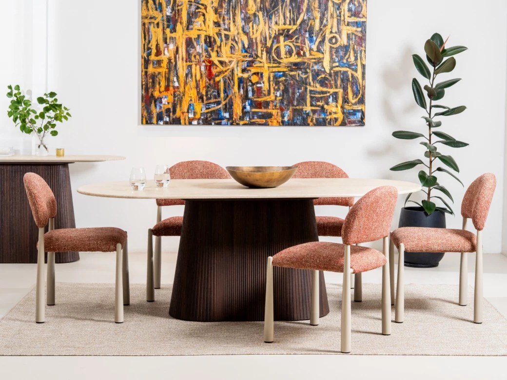 Elevate your dining experience with this elegant dining table, featuring a luxurious stone top with a refined travertine finish. The smooth, sophisticated surface brings timeless charm to your dining space, while the sturdy corrugated MDF base, finished in a rich espresso tone, adds depth and contrast to the design. This table's blend of modern style and classic appeal makes it the perfect centerpiece for contemporary dining rooms, offering both durability and beauty for everyday use or special occasions.